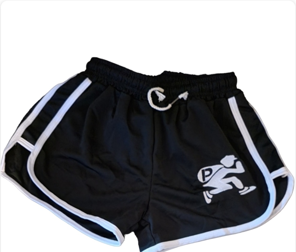 Pilfers embroidered athletic shorts with revised embroidered Pilfers logo